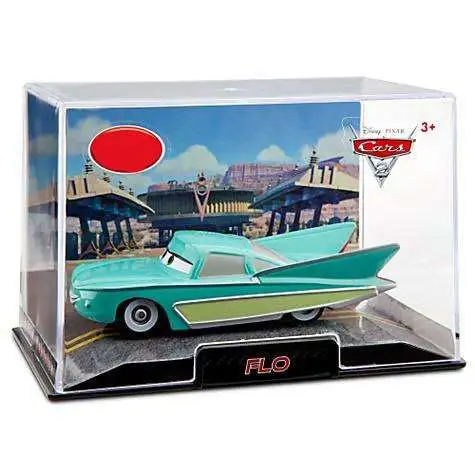 The owner of Radiator Springs V-8 Cafe and Ramone’s sweetheart, Flo is captured in fine-detail with this Flo Cars 2 Die Cast Car. Flo arrives in plastic display case with scenic backdrop picturing Flo’s V-8 Cafe.