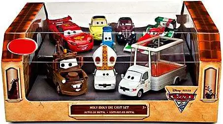 Disney Store Cars 2 Holy Moly Die Cast 8 Piece Set. Set is a brand new Disney Store release. Package is new, never opened. Cars included in set are: Lightning McQueen, Mater, Francesco Burnoulli, Pope Pinion IV, Pope Mobile, Uncle Topolino, Luigi & Guido.