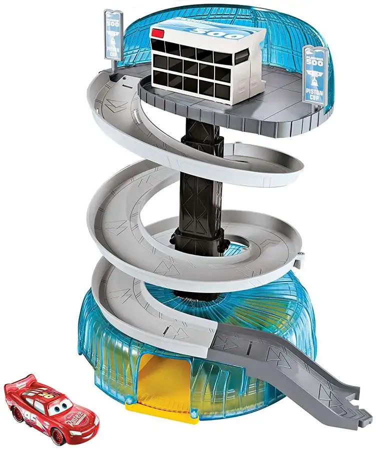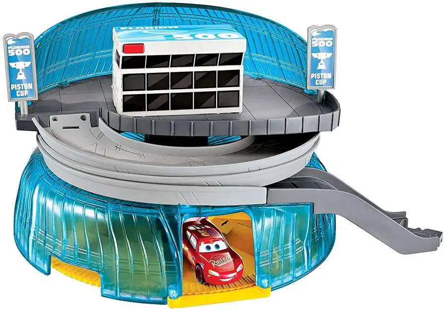 Triple your Disney/Pixar Cars 3 action with this Florida Speedway Garage! Its spiral ramp, expanding play areas and multi car storage case deliver before, during and after race fun! Just pull to expand the set high and then send the included Lightning McQueen vehicle racing down the ramp. It will speed through multiple spirals, aiming for the road. You can also connect the Florida Speedway set to have the champ race on to the films epic new course! This set is full of colorful, movie inspired details and authentic prep areas for inventive storytelling! Recreate the climatic competition scenes from Cars 3 with the Florida Speedway Garage and Florida Speedway Race Set, together then use the stow and go garage feature to store other vehicles inside and get ready for the next adventure.