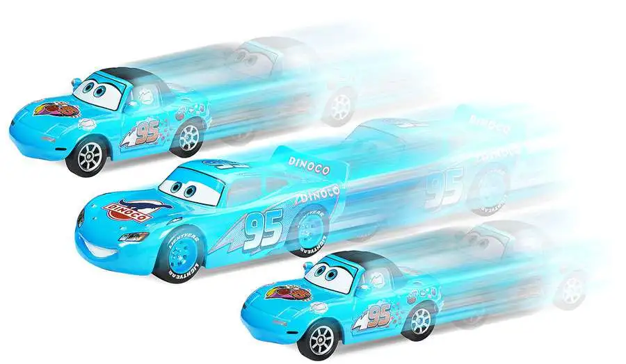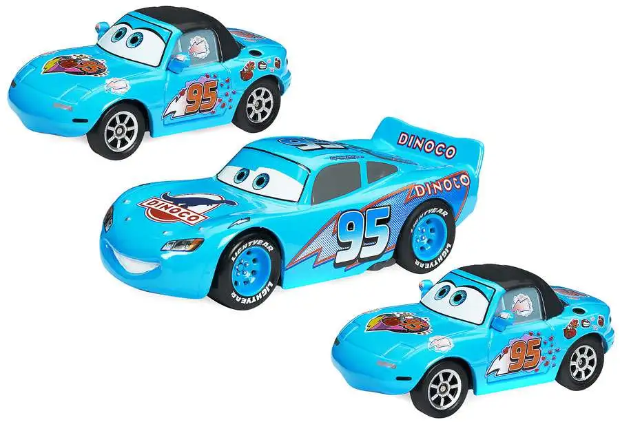 Triple your driving fun with this set of Tia, Lightning McQueen, and Mia die cast cars. Featuring pullback action and coordinating blue paint scheme, this Dinoco Dream team of Cars characters will put the play time pedal to the metal.