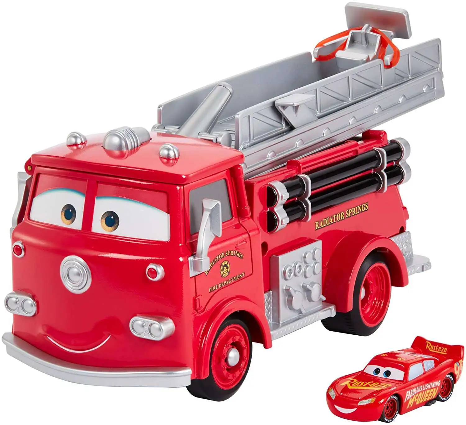 Color Changers cars transform like magic, and now with this oversized firetruck, Stunt and Splash Red, kids have all new ways to play with this super cool Color Changer technology! Red works with color change vehicles for four ways to play: spray, dunk, launch and stunt! Fill Red’s water tank with cold water and the ring of fire tank with warm water. Practice putting out fires with the flame targets using Red’s hose, then stage daring stunts! Will Lightning McQueen be able to jump and clear the ring of fire or will he land “splash!” into the water tank changing him from blue to red? If he ends up in the tank, a few sprays from Red’s hose changes Lightning’s paint color right back to blue! Cold water turns Color Changers vehicles back to their original colorswhat a blast! Set includes one exclusive color change Lightning McQueen vehicle. A great gift for Cars fans, age 4 and older.