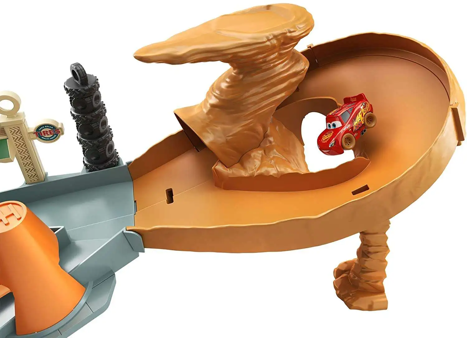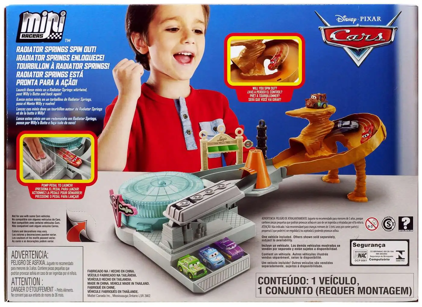 Taking kids back to where it all started! This super cool Radiator Springs-themed playset offers lots of familiar features that Disney and Pixar’s Cars fans will love, like Flo’s CafΓ© and the iconic red rock mountains! Rev the engine to send mini vehicles flying around the track and through the Cozy Cone. But be careful not to drop into the pit! Playset includes one mini metal Lightning McQueen car with mud tires. Add other mini vehicles (sold separately) for lots of crashing and smashing fun!