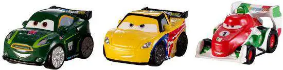 These small scale vehicles feature ball-bearing technology that allows them to race, drift and swarm-just like they do in the DisneyoPixar Cars films. Sold in packs of three, kids will want to collect them all! Pack Includes: Jeff Gorvette, Nigel Gearsley & Francesco Bernoulli