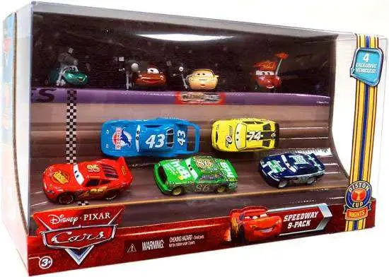The fun of the animated sensation continues with the Cars Character Cars. These 1:55 scale die-cast cars are big on personality and detail. This is an exclusive set which includes 4 new vehicles, and 5 classics racers.