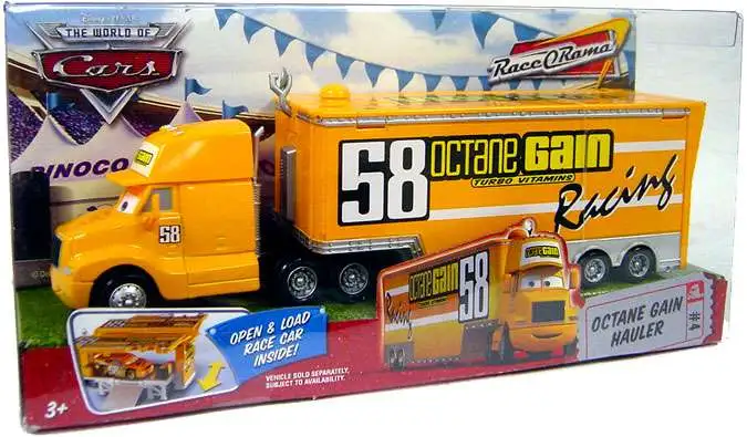 This Race-O-Rama hauler opens on both sides to load your car inside! Vehicle sold seperately.