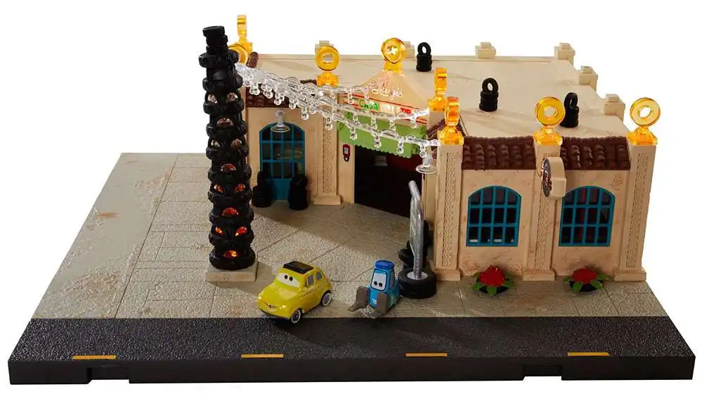 Fans and collectors of Disney/Pixar Cars will love this premium Luigis Casa Della Tires set! This true-to-movie setting is loaded with iconic details, lights and moving parts that create full service, realistic fun. Drive in and the exclusive Luigi and Guido vehicles will fit you with new wheels and tend to your street and track needs with expert care! Luigis headlights really work and his trusty assistant Guido features a moving lift to enhance the movie fun. Expand the excitement and build out the world of Radiator Springs by connecting this premium set to other Precision Series collector playsets (sold separately, subject to availability), then cruise or race your way to glory with your favorite Disney/Pixar Cars characters! Comes in a Try-me package to check out the light-up action in advance. Colors and decorations may vary.