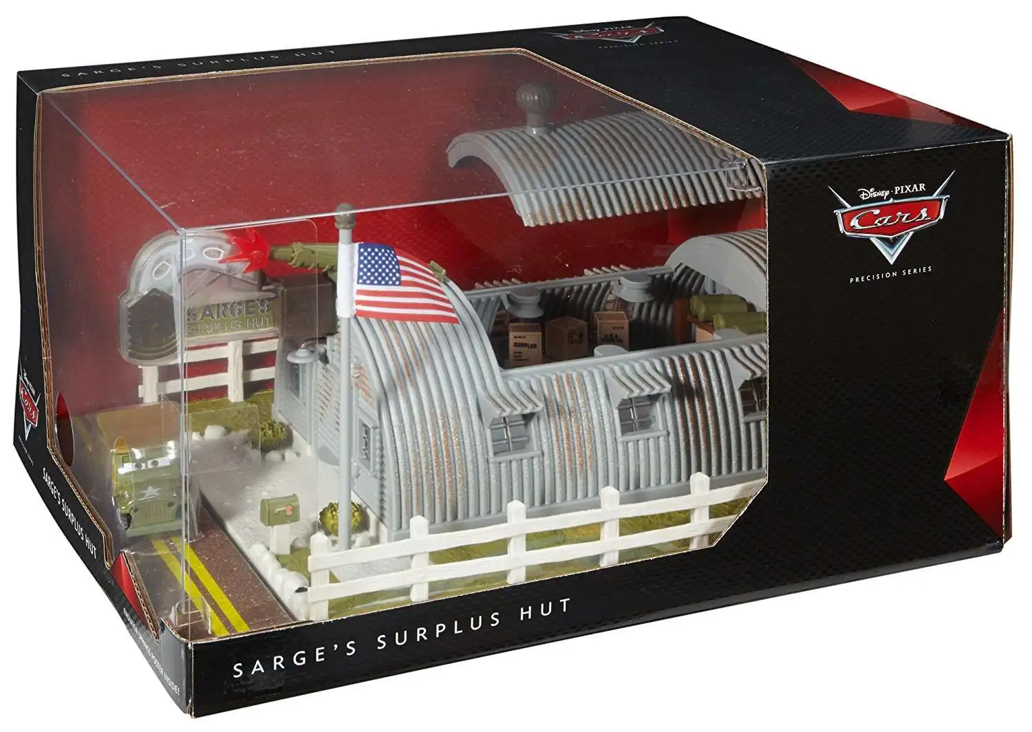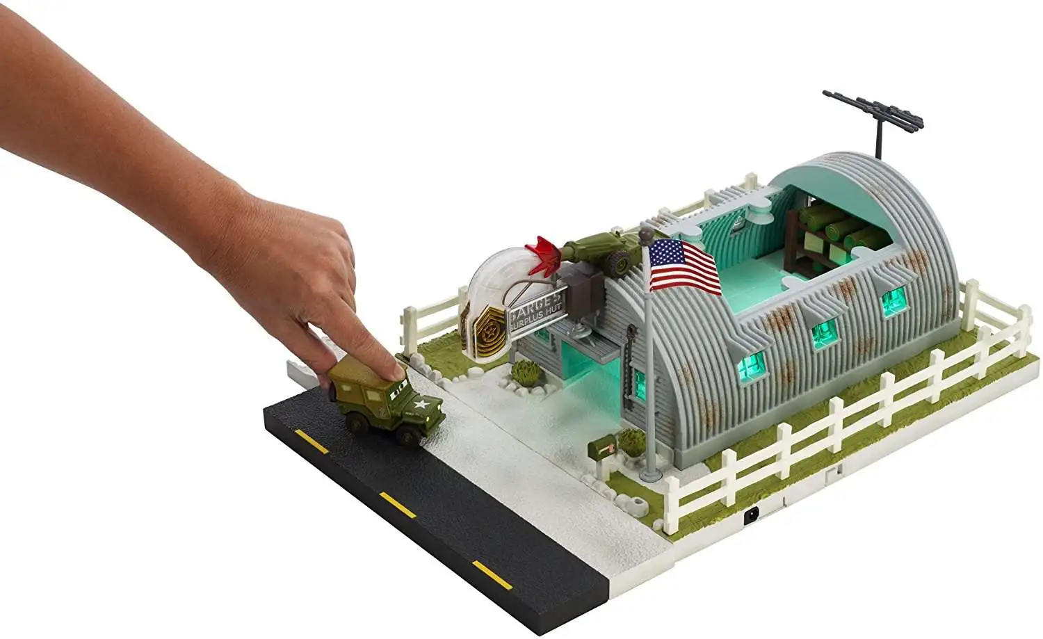 Hey, Disney/Pixar Cars fans, your favorite Army Jeep has a cool, new military themed story set! Drive in for tons of action and true to movie fun! Sarge’s collectors play set features authentic barracks with rich details, a roof top cannon, a light up sign for day and night play, a flag pole, and an exclusive Sarge vehicle! And that’s not all: the barracks open up into a large play area where top secret Cars missions get hatched and built! Come on by Sarge’s, soldier, for all your government surplus and active duty needs! Requires AAA batteries, included.