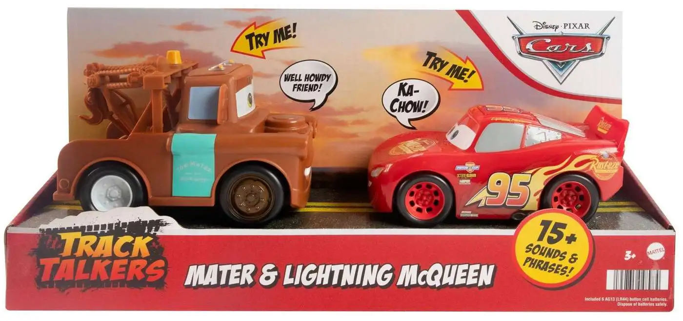 This Disney and Pixar Cars Track Talkers pack features 2 talking character cars together in one pack — Lightning McQueen and Mater!Disney and Pixar Cars Track Talkers vehicles speak iconic phrases and radiate sound effects that bring the characters to life!