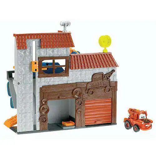 “This playset is inspired by the new Cars 2 movie and boys will love playing out their favourite Spy Mater movie moments! This playset includes Mater, a telescope, disguise, rocket, jet-pack and radar dish. The front of the playset looks like a normal garage in Radiator Springs, but when Mater drives up and places his wheel on the secret pad, it opens the door and reveals a secret spy headquarters! Roll Mater up the ramp and attach all of this spy gear! The playset also had two stories. Place any of the Imaginext Cars 2 vehicles in the elevator and lift the vehicle up to the top level. Place the vehicle near the computer consol and rotate the activation disk to activate the claw down below! Boys will love making Mater a secret spy and playing out their favourite scenes from the movie!”